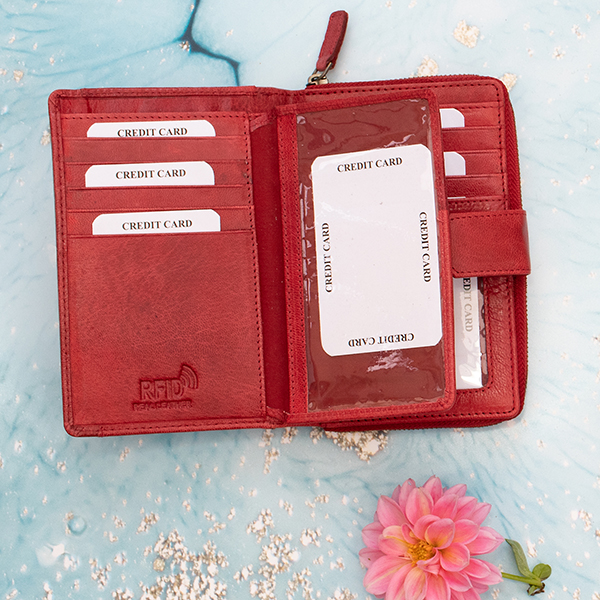 It features enough slip pockets for all your cards while the transparent plastic pocket offers the ideal place to store your driving licence, allowing you to show you ID without having to remove it. The zipped compartment will keep your loose change safe, while the secure closure and built-in RFID protection will give you complete peace of mind.