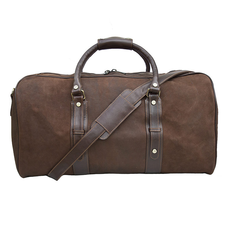 Prime Hide's duffel holdall. Lovely brown distressed leather holdall with a brown vegetable tanned leather trim and strap with enough room for an extended holiday, or a perfect leather weekend bag for those longer weekend stays. Despite its size, the comfortable shoulder strap and padded handles make it easy to wrangle through any number of connecting flights or ports of call.